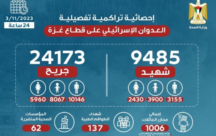 الصحة: الاحتلال الإسرائيلي يقتل 9061 مواطناً و يصيب نحو 32 ألف بجراح مختلفة منذ بدء العدوان في السابع من اكتوبر الماضي02/11/2023|